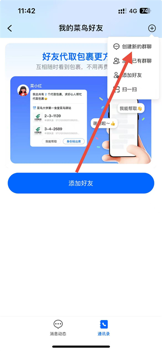 2、进入我的菜鸟好友页面后,点击右上角加号图标展开菜单。