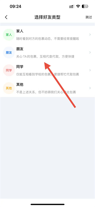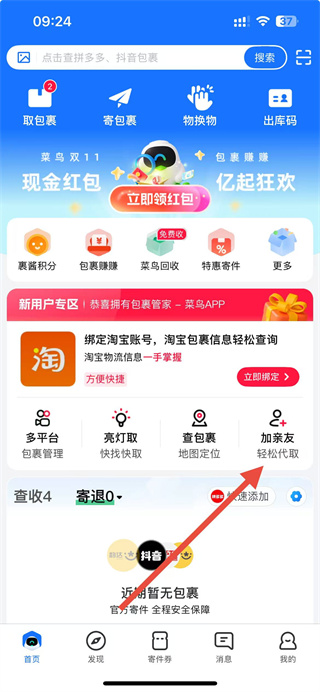 1、在菜鸟app首页,点击加亲友选项,进入选择好友类型页面。
