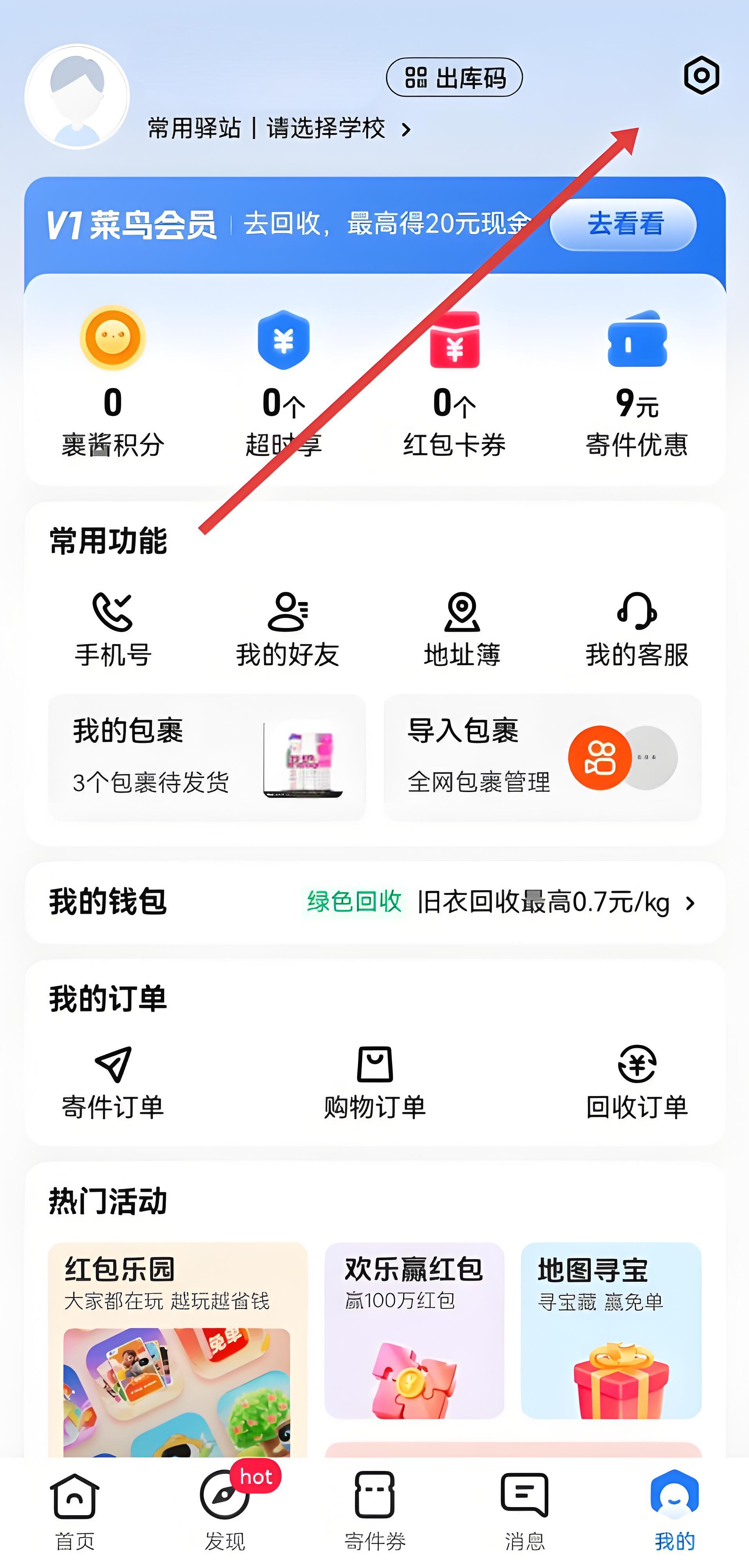 1、在菜鸟app个人页面,点击右上角的设置图标,进入设置界面。