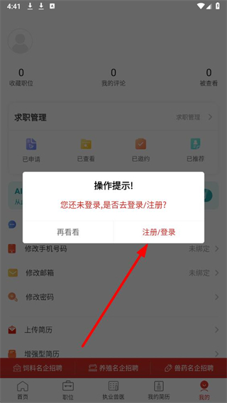 3、在我的页面,提示您还未登录,是否去登录/注册,点击注册/登录。