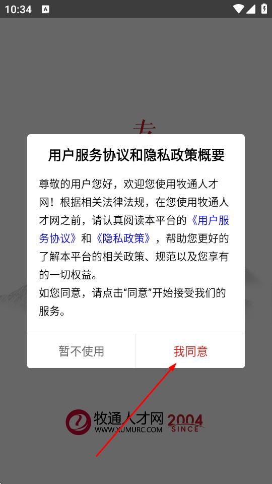 1、打开牧通人才网APP,在弹出的用户服务协议和隐私政策概要窗口中,点击我同意。