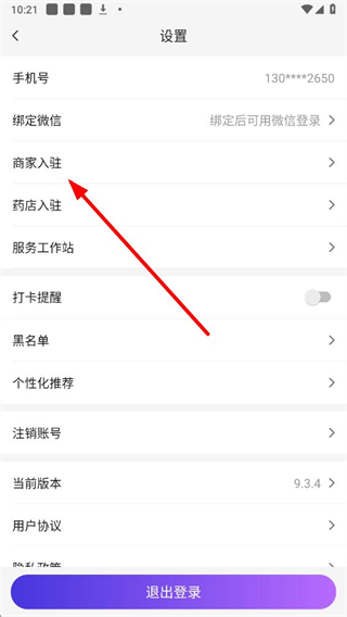 3、在设置界面里,选择商家入驻选项,进入商家入驻信息填写页面。
