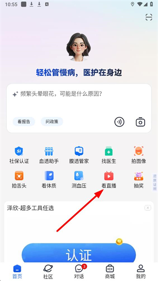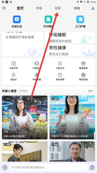 1、在老来健康app的主页面中,点击顶部的社区按钮,跳转到社区页面。
