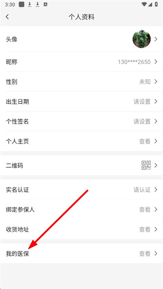 2、在个人资料页面,找到并点击我的医保选项,进入医保相关功能配置界面。