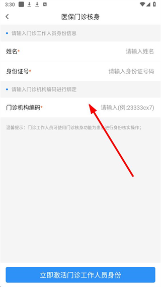 4、在页面填写门诊工作人员的姓名、身份证号及门诊机构编码,点击立即激活门诊工作人员身份完成激活。