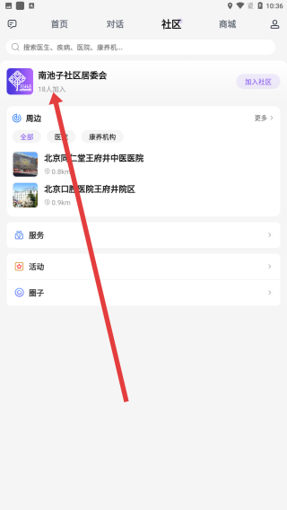 2、进入到社区页面中,可以点击箭头指向的社区图标区域查看详情。