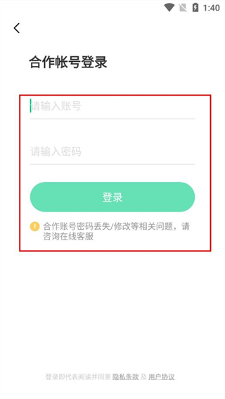 3、在合作帐号登录页面,输入对应的账号和密码,点击登录即可。