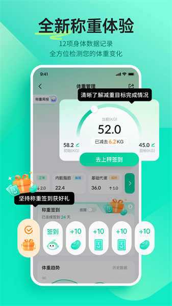 体重管理者必备APP,专业饮食运动方案制定,体重管理师在线指导,让曲线、健康更近你一步。