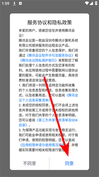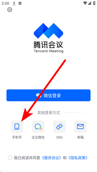 1、打开腾讯会议,在弹出的弹窗中点击同意,进入登录选择页面。
