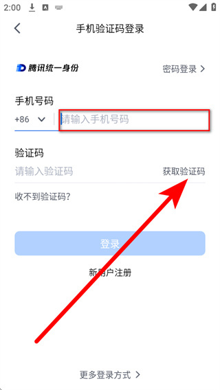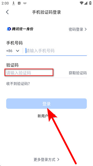 2、在登录页面点击登录方式下方的手机号,切换到手机验证码登录界面。