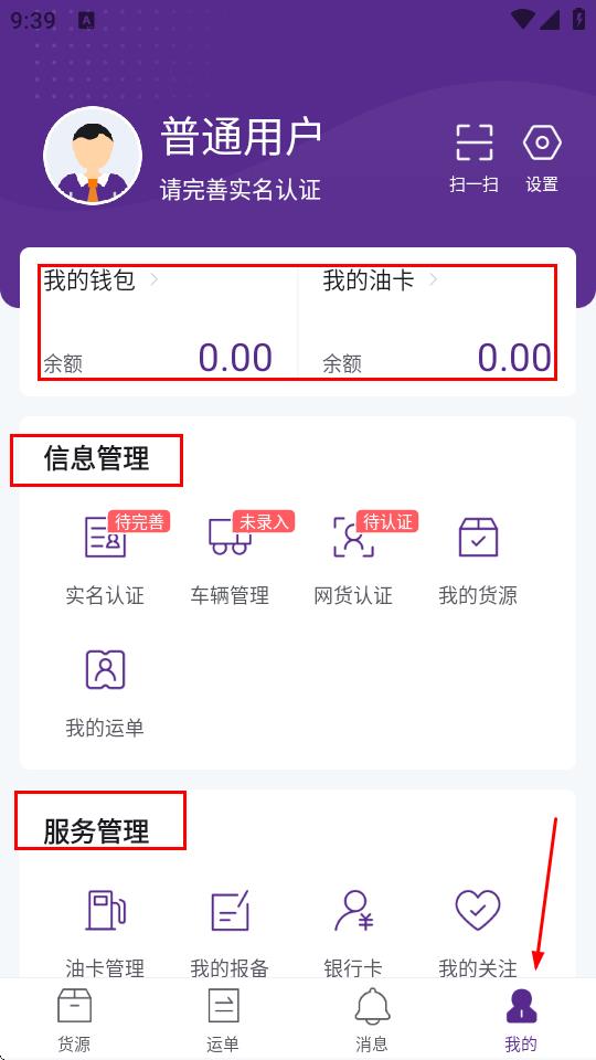 4、在我的页面,设有我的钱包、我的油卡,信息管理、服务管理,帮助司机了解更多信息。
