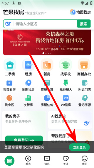 1、打开芒果找房,在首页底部点击立即登录,进入登录方式选择页面。