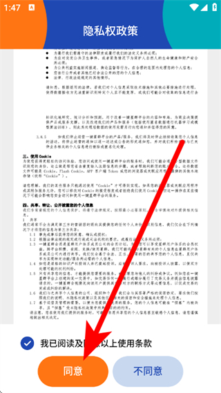 1、打开一键星群,在隐私权政策页面,勾选后点击同意,进入注册页面。