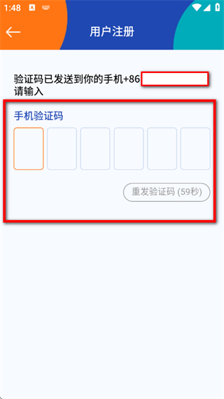 2、在用户登录或注册页面,输入手机号码,点击确定,进入验证码输入页面。