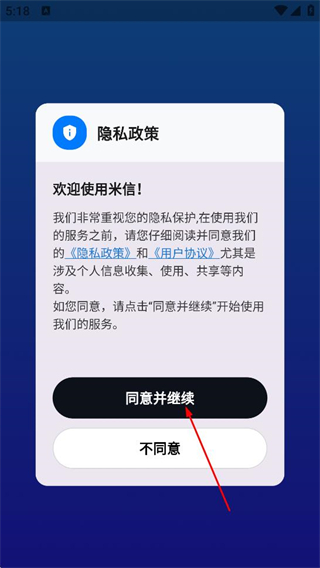 1、在隐私政策弹窗中,阅读隐私政策和用户协议后,点击同意并继续。