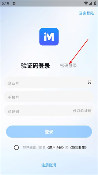 2、在米信的验证码登录页面,点击密码登录选项,切换至密码登录界面。