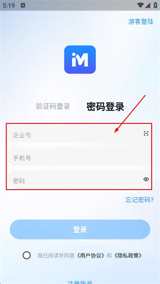 3、在密码登录页面,依次填写企业号、手机号、密码后,点击登录,完成登录。