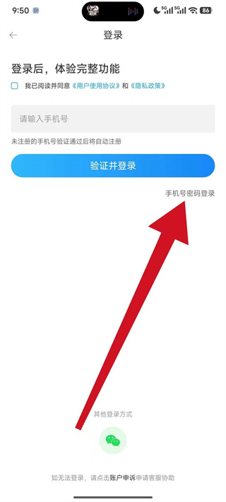 3、在登录页面里,点击手机号密码登录,切换至账号密码登录界面。