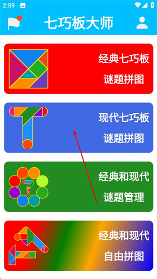 1、在七巧板大师首页点击现代七巧板选项,进入现代七巧板分类页面。