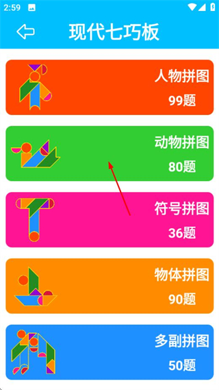 2、在现代七巧板分类页面选择目标拼图类型,进入对应拼图关卡页。