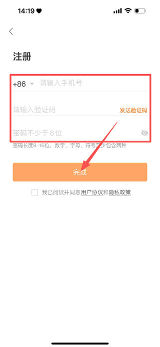 3、在注册页面,填写手机号、验证码和密码后,点击完成,完成账号注册流程。
