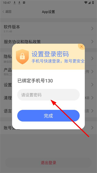 4、在设置登录密码弹窗中,输入想要设置的密码,点击完成按钮即可完成密码设置。