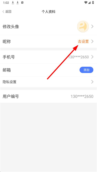 3、在个人资料页面,找到昵称选项,点击右侧去设置按钮,进入昵称修改界面。