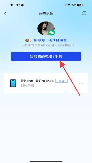 3、在我的设备页面内,点击添加我的电脑/手机的按钮。