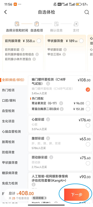 6、进入自选检项页面,选择需要的体检项目后点击下一步。