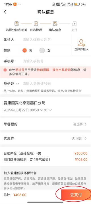 7、在确认信息页面,填写体检人信息,点击去支付完成预约。