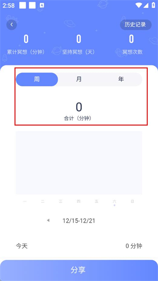 3、在冥想数据页面,即可查看周、月、年维度的冥想时长等数据。
