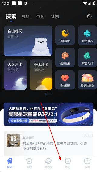 1、打开冥想星球APP,点击底部练习,进入练习页面。