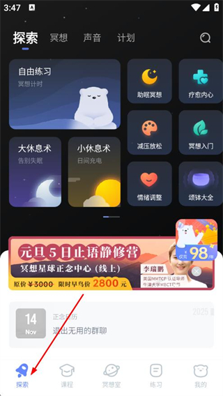 查看步骤拆解和练习精讲,帮助你从冥想小白一步步入门成为真正的冥想练习者