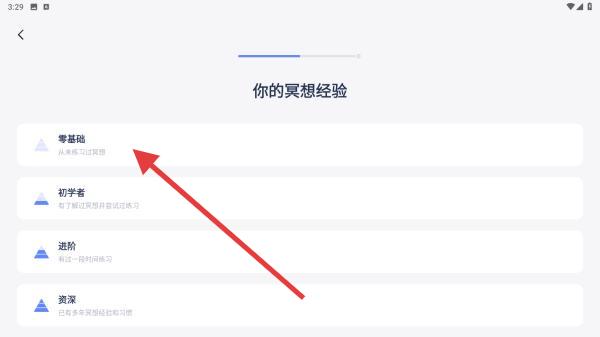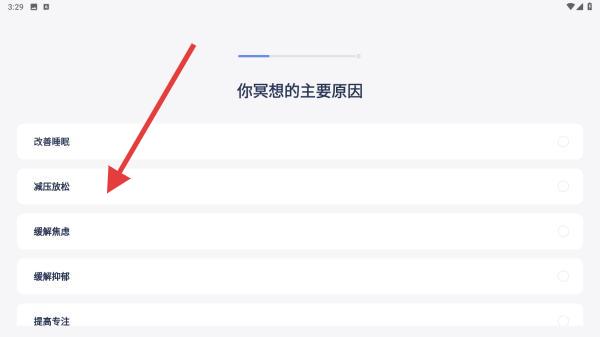1、首次打开APP,依次选择冥想的原因,如减压放松、改善睡眠、缓解焦虑、缓解抑郁等,选择后方可进入。