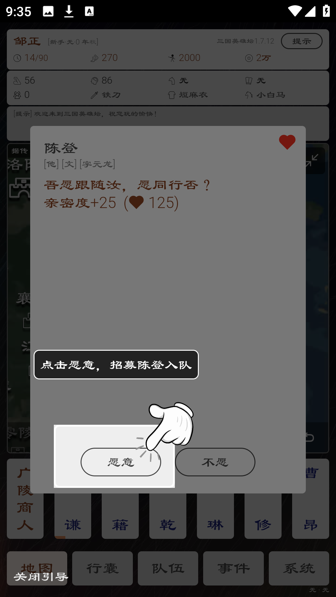 5、简单上手:游戏操作简单,点击郡城进行征兵和讨伐,点击武将名字进行战斗和交谈。
