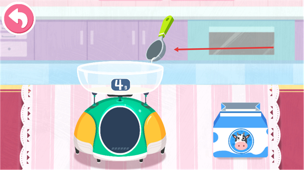 2、用勺子添加材料到秤上容器,让秤显示4g,继续制作流程。