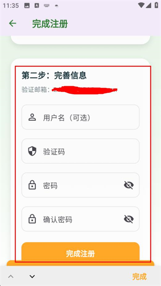 4、在完善信息页面填写内容后,点击完成注册按钮创建账号。