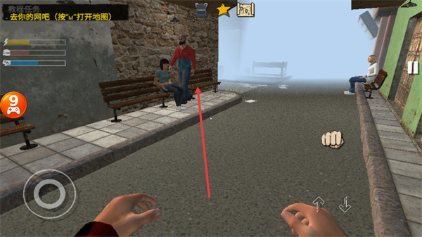 4、继续向目标区域移动,靠近街道旁的人物,推进前往网吧的流程。
