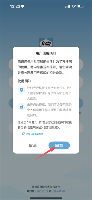 1、在用户使用须知弹窗中,点击同意,进入丝涟智能生活的登录页面。