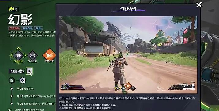 幻影的核心技能幻影诱饵可释放一个朝指定方向移动的分身,抵达目标点后进入警戒状态。此时玩家可选择销毁本体,将意识转移至分身上,实现快速位移或骗枪。升级天赋一后,销毁本体会短暂暴露周围敌人位置,适合侦查敌情,天赋二则能让分身同步释放电子捕网,形成双重控制。诱饵常用于吸引火力,例如在废弃电站地图中,可让分身沿主路前进,本体则绕后偷袭,迫使敌人分散注意力。