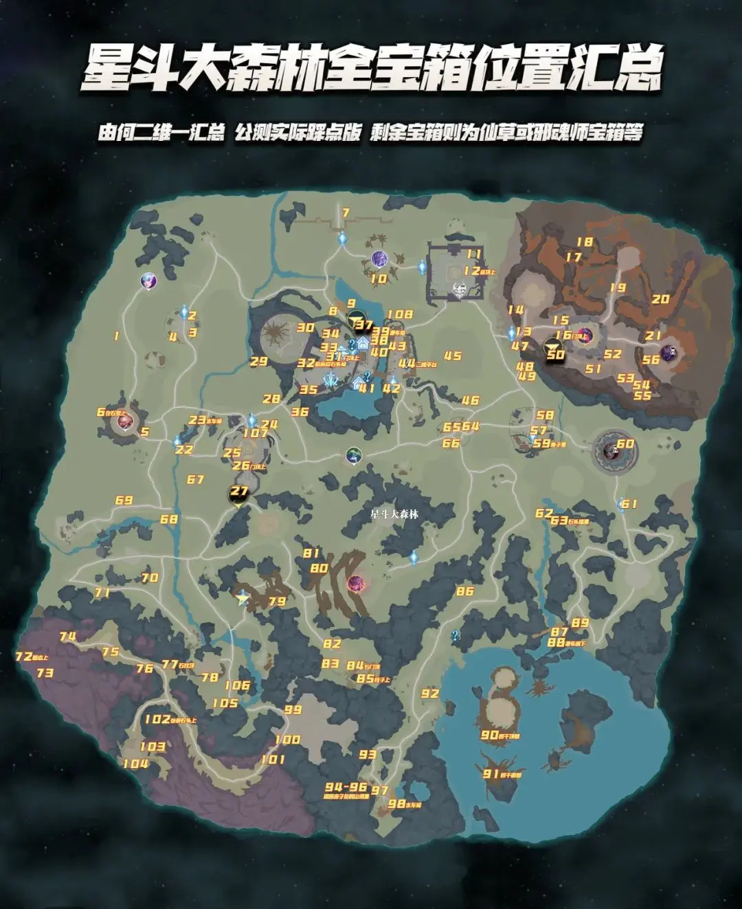 首先还是宝箱的收集,虽然星斗大森林的秘藏总数量为180个,但不用打邪魂师或者是仙草秘藏等能拿到的宝箱总数为108个,上图为全部108个宝箱的位置标注图,其中每一个维一今天都进行了实际踩点。