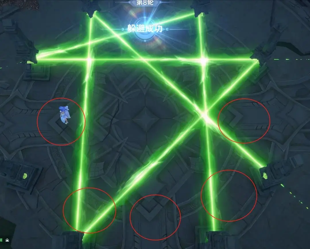 接着星斗大森林地图的三个试炼点,其中的凤凰试炼就是打怪兽,我们只需要堵门打即可,其中穿插使用q或者e技能即可,难度并不算高。然后蓝银草试炼就更简单了,顺时针慢慢走即可,不要太快......而最后的幽冥猫试炼是一个要躲射线的小游戏,维一试了很多次,这个射线的每一关都是随机出现的,所以没有一个固定的走法,而下图中维一标注出来的红色圈圈,都是靠边缘的位置,这些位置是相对比较难好躲射线的,大家可以适当的选择站位,总体来讲过关的难度并不算很大。