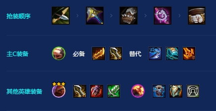 老鼠羊刀无尽必备,第三件可以选择巨杀、杀人剑或破防。他技能自带破甲,不用做轻语。呲呲想C需要再做把无尽,其他两件做战士装饮血+血手。肉装不着急,等3-4阶段再补,一般是给人马做个冰甲打控制。