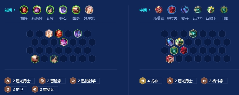 1.前期根据来牌用2屠龙搭配任意羁绊过度,中期没有转职之前用4龙神4屠龙过度,有转职后开8屠龙。