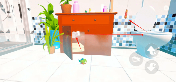 先从红色柜子里咬住一卷纸巾,然后跳到马桶里松开,马桶会被堵住,这个时候再去拉抽水器就能使水位上涨