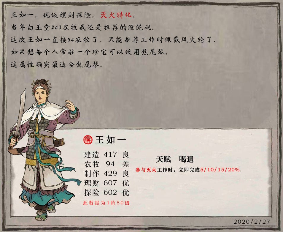 王如一的属性偏向理财和探险,推荐搭配风火轮或者焦尾琴,提升灭火的进度。