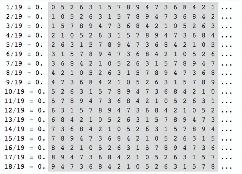 从1/19到18/19的18个分数的小数部分的长度是18。将这18个周期部分安排为1818的数字阵列,该阵列仅形成一个魔术广场——每行,列,两条对角线上的数字总和为81(注意:注意:严格地认为,它是一个魔术平方,因为它是一个方形的数字,因为有一个正方形的数字。