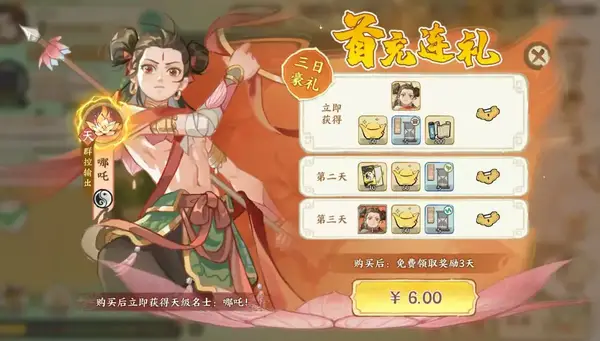 用少量元宝在「绘世长阶」提升阶级,升到2级后,花18元+30元购买一级和二级礼包,即可让哪吒三星。此外,推荐30元月卡:购买后立即得10张五行拜帖 + 300元宝,此后一个月每天得300元宝 + 若干特权,长期收益极高。