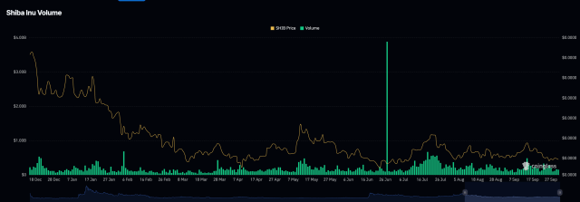 低交易量表明柴犬币尚未具备大幅反弹条件。历史数据显示,该迷因币此前爆发最大涨幅的时期均伴随交易量激增。