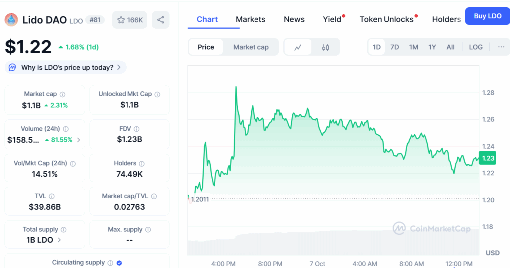 CoinMarketCap数据显示,Lido DAO现报1.22美元,24小时涨幅1.68%。该项目市值在此期间增长2.31%至11亿美元。完全稀释估值(FDV)保持12.3亿美元,与流通供应量相符。